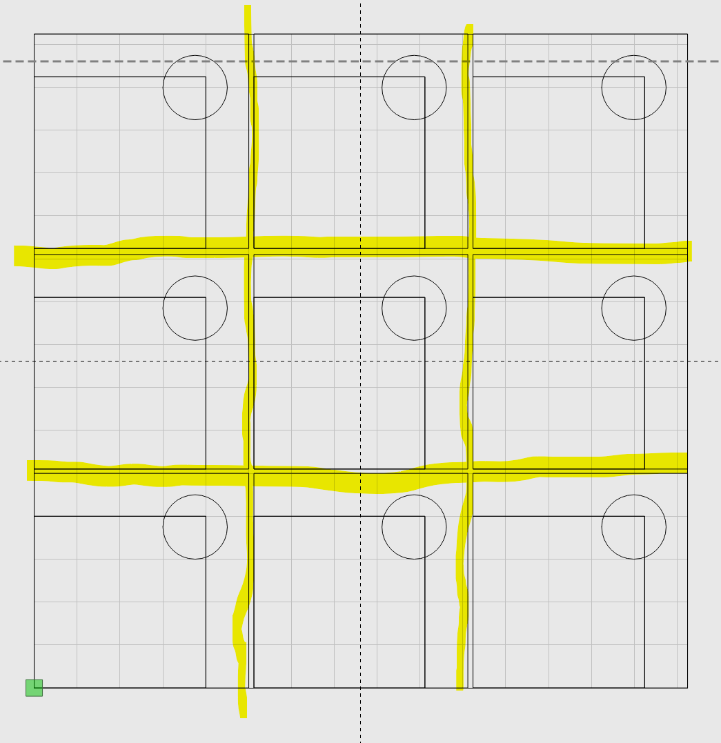 Issue: I am replicating multiple items on one piece of aluminum and want the software to do all of the calculations for a “No-Go Zone”. I want to know how far apart my next image has to be placed, when considering the diameter of my bit used to cut out each square. The yellow areas have been highlighted to show the space between each object.