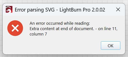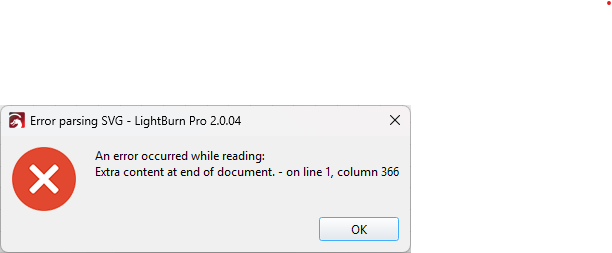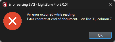 Update: If I enable the “Include SVG Code” option under IIllustrator > Preferences > Clipboard Handling (Windows), then copy the SVG content into a text editor first and paste it from there into Lightburn, it works correctly. This confirms there’s a compatibility issue between Illustrator 2026 and Lightburn when pasting directly—regardless of whether the option is enabled or not, the error still occurs.
