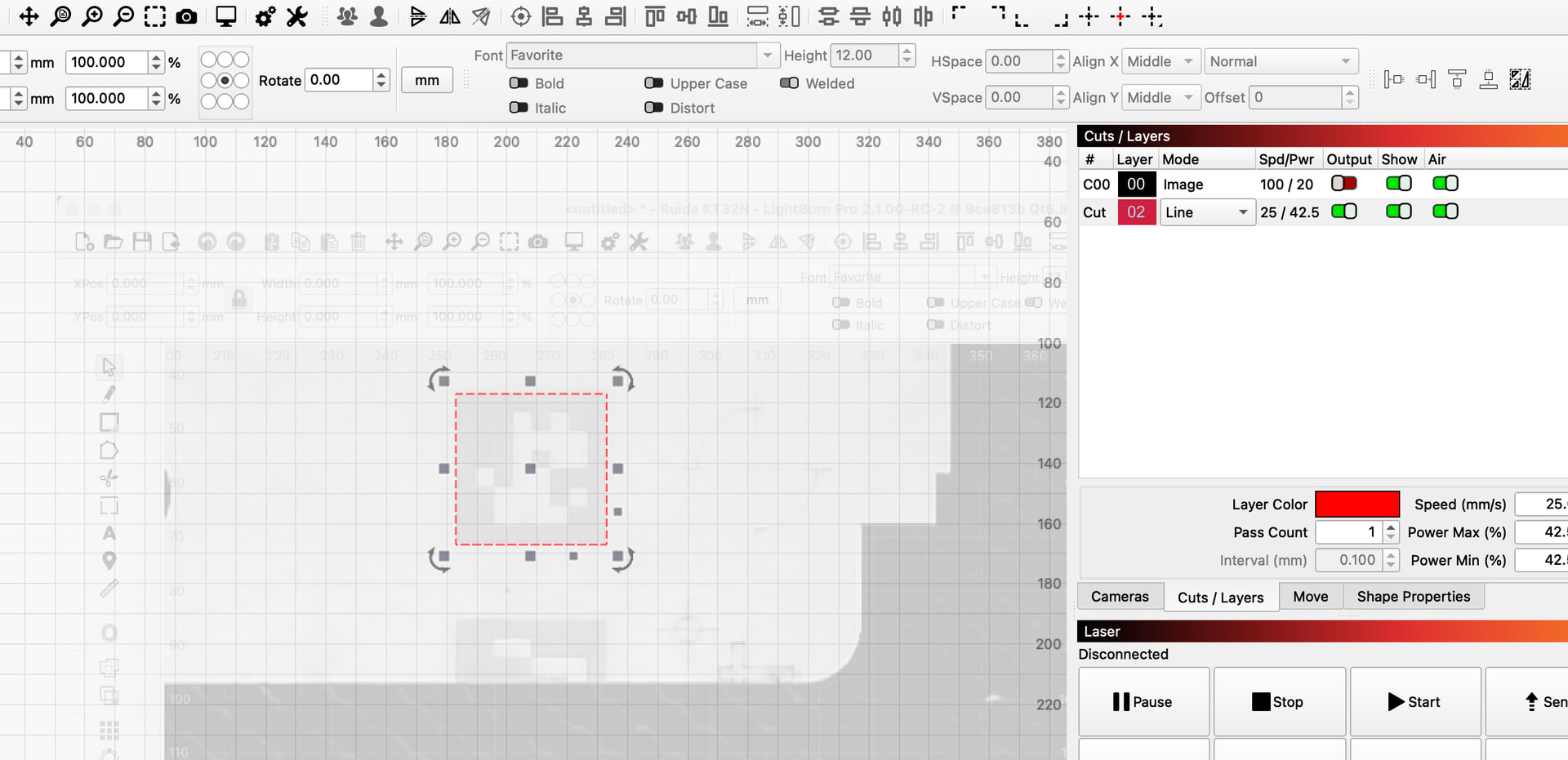 Before starting the actual engraving I always use the Frame option to see how the design is positioned with the object. Now unfortunately that picture (basically the image layer) is always taken into account while framing, so that is why I have to delete the image to see the expected frame and save it in a different file.