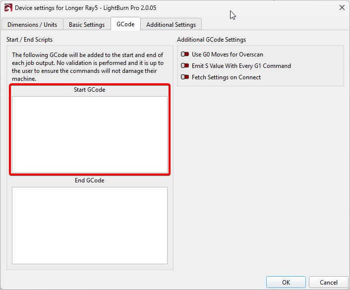 Rather than re-Home my machine for every run, I do not move the laser by hand. I have created a Macro that moves it to a handy location. For example, I use something like G0 X380 Y385 and name it “Retract” to move it to out of the way in a back corner.