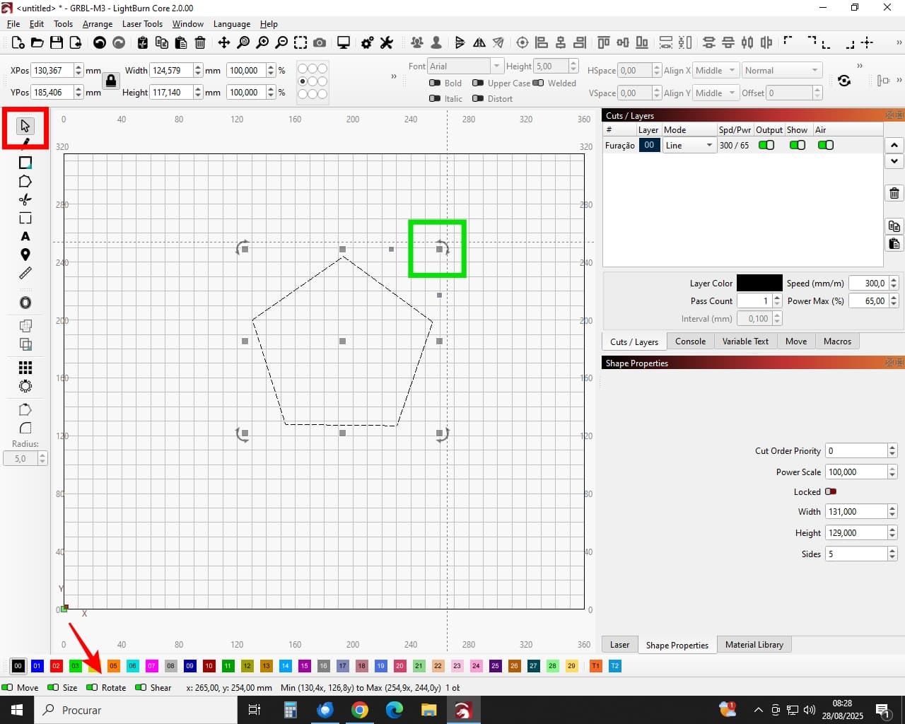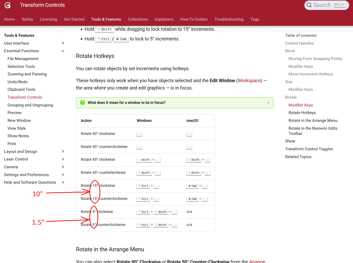 On my computer (Windows 11, LightBurn 2.0.02), when I use the HOTKEY for rotation, it rotates by 10° and 1.5° instead of the values shown in the documentation (15° and 5°).