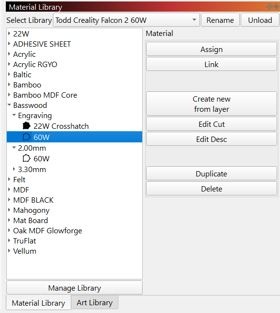 In my experience, I’d find a preview of the cutting settings very helpful in the material library for the selected item.