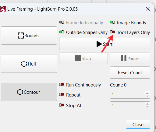 If you have issues with your laser not framing before firing, check the “Tool Layers Only” toggle in the framing/firing screen. I’ve got a screen shot for reference and it solved the problem.