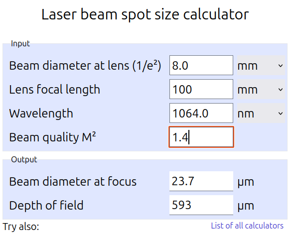 This uses the 8mm beam diameter that JPT states is the output of my fiber, if I remember correctly, but it can vary as the sources change. The other is beam quality, or how well it fits with the Gaussian power curve.