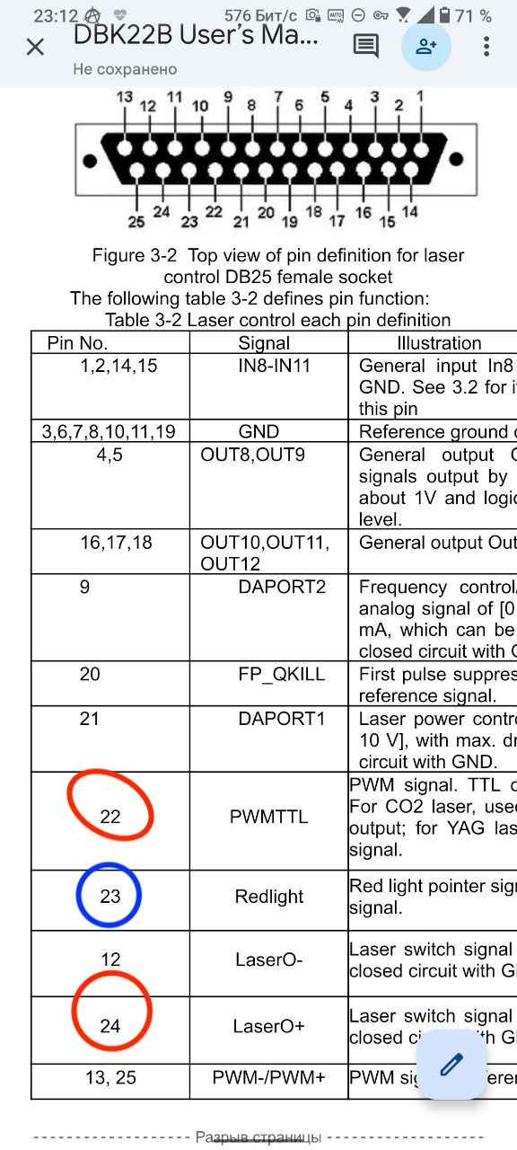 We use the following pins on the controller: pin 22 for PWM, pin 24 for laser activation (should be 0 when the frame is displayed), and pin 23, which is used in the controller as an alternative pin for the red pointer (we don’t have one). In Lightburn, when the frame is displayed, pin 24 is active (1) and pin 23 is also active (1), so the frame is not displayed. In BSL Seacad, pin 24 on the frame is inactive (0) and pin 23 is also active (0), but pin 23 can be set to (1) in the BSL settings. I can send video to you.