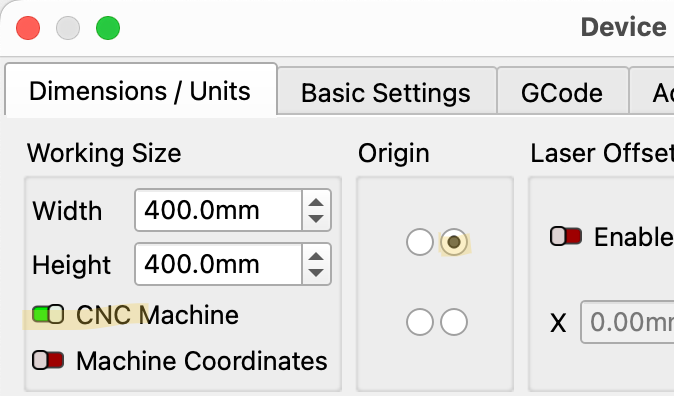 If you see it, enable the ‘CNC Machine’ setting in device settings, and set the axes Origin to rear right. This will cause LightBurn to address the machine in the negative machine coordinate space it is naturally in (instead of using the X-397,Y-397 G54 offset that was set before).