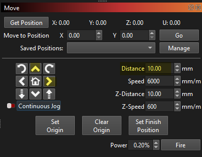 After homing, to test if your machine origin/direction settings are configured correctly, try to jog the laser head towards the centre of the working area using the back (Y+) and right (X+) direction arrow buttons in the ‘Move Window’ as highlighted below;