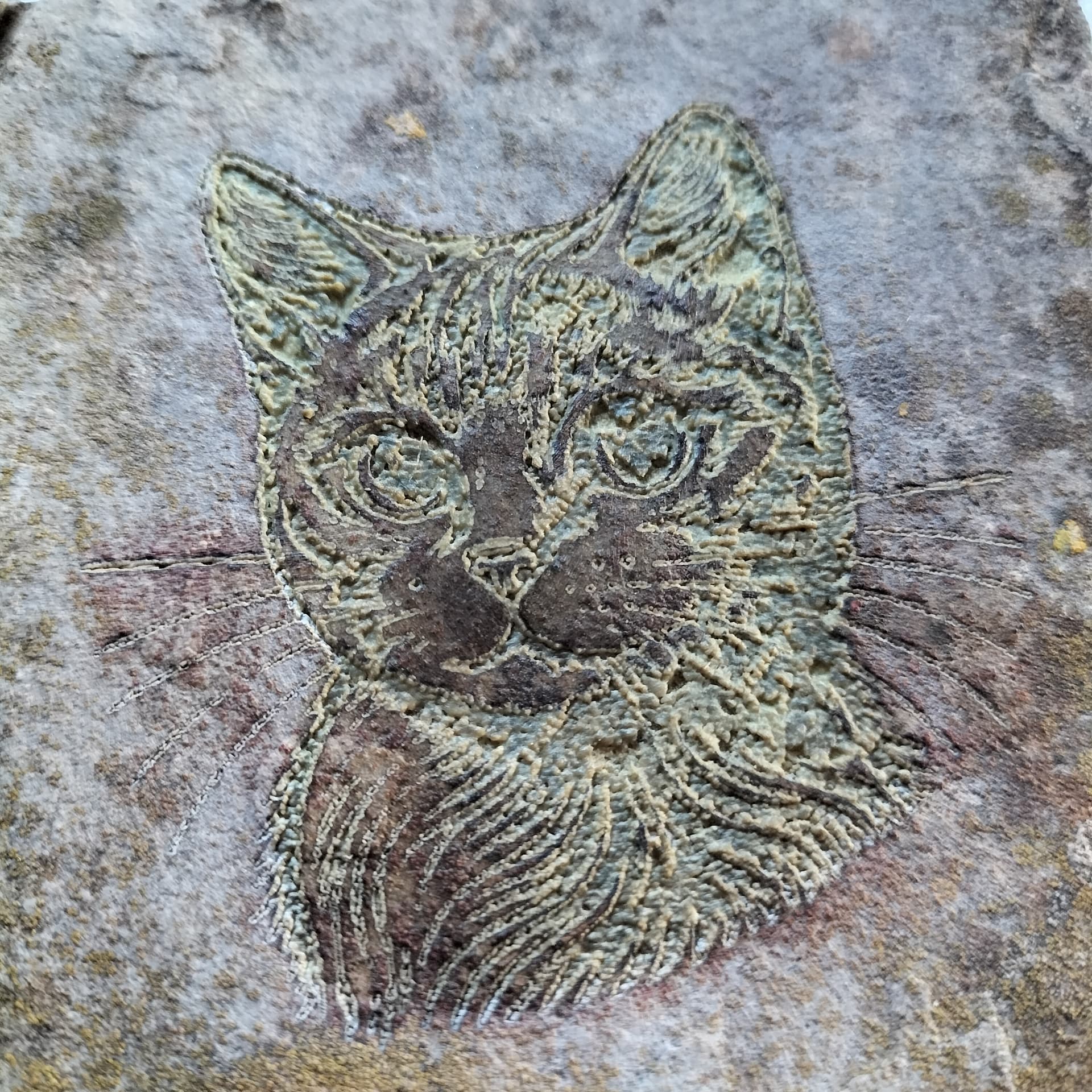 A first attempt. 500mm/min at 90% 1 pass with a 20W led laser. The stone is sedimentary rock, sand based and quite soft. Looks like a fossil. More practice tomorrow. I think a slower pass and more of them.