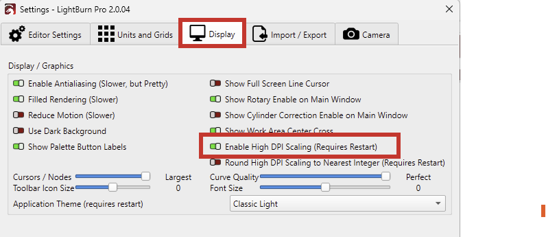 LightBurn Bug Report: Galvo Cut Settings Window Cut Off (Windows)