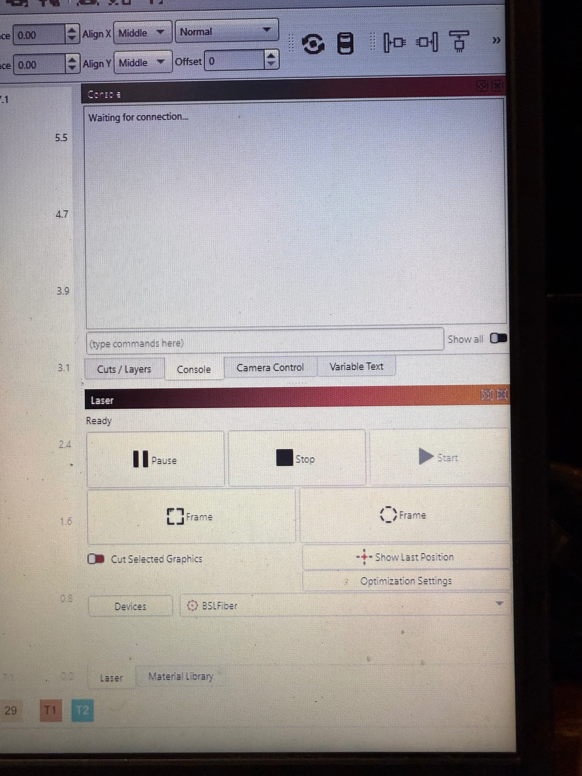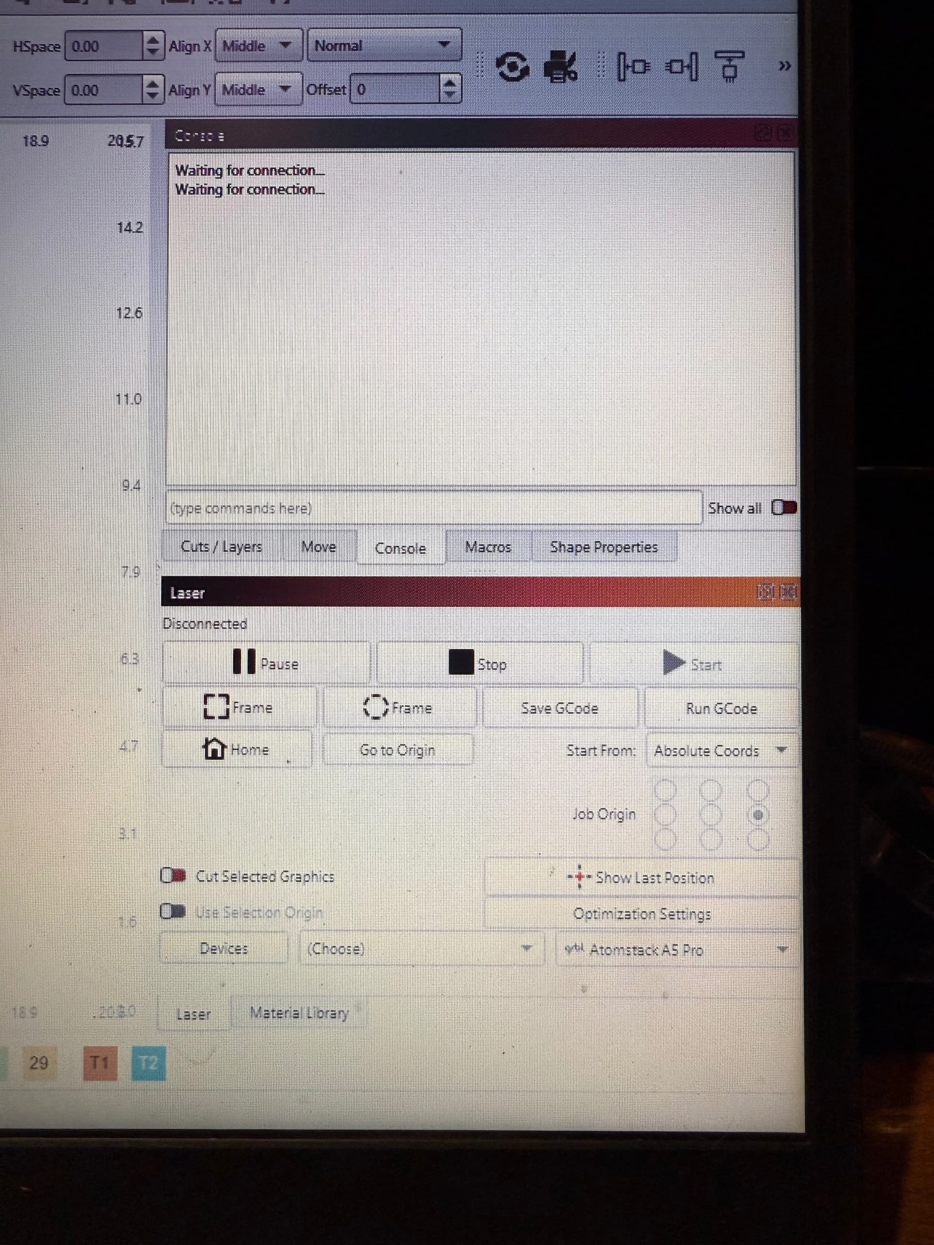 Now, when I open Lightburn it defaults to my Atomstack diode laser and in the console tab I can see that it is trying to connect. No problem here. But when I select my G2 Pro Fiber laser or my OMG-50 w fiber laser the console tab disappears. I have to go back to window tab and select console again. This time however it is greyed out. And when I click on any other tab the console tab disappears again. I have included screen shots, hopefully, to show this. I’ve also deleted lightburn 3 times and restated my computer twice. Hopefully, someone has an idea here.