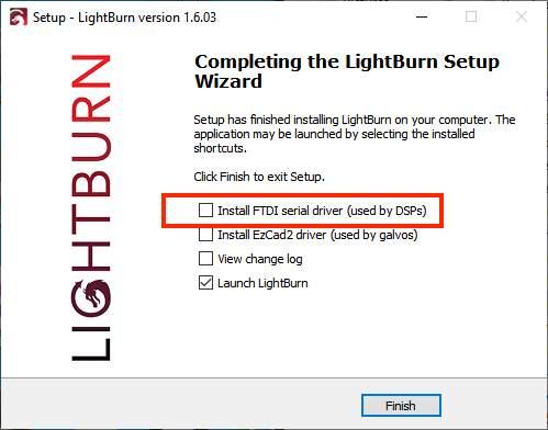 Upon installing LightBurn on your new computer, did you check this box to install the FTDI drivers? If not, simply reinstall LightBurn and check this box: