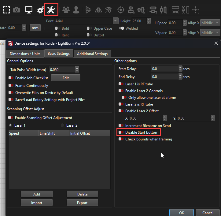 A better option if you really want to start the job from LightBurn, is to use Alt+Shift+S or hold down the Shift key as you click on ‘Send’ so the job auto-starts only after it has fully transferred to the machine.