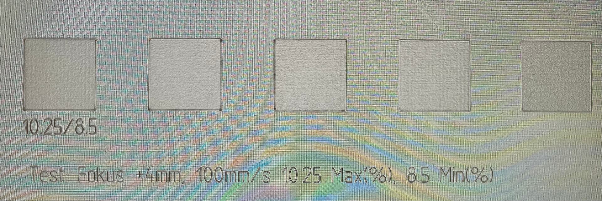 For normal fill engraving I use 100mm/s (200mm/s, depending on object size), 10.25% Max and 8.5% Min Power, Line spacing 0.07 - 0.1 mm and a focus of +4mm