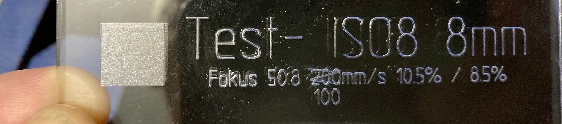 Your numbers were right on. 100/10.3 was the magic number for me. This proved that it was possible to improve the result. However, when switching to the painted sheet it took much more time and a little more power to get through to the acrylic. The result was nice but the characters were just a little to thin (and I cant seem to burn the dots on the "I"s). Not at all the melty mess as with the TrueType fonts. I am new to SHX and found that I couldn’t set the characters to fill. If I did, they looked like weird WingDing characters. Is there a way to thicken them or do I just need to find a better set of fonts with slightly thicker characters? I was thinking, as someone here mentioned, about offsetting the focus but that seems like it’d be pretty hairy as the material thickness isn’t very uniform. I’m not sure if Lightburn has a “dithering” function which would be a possible way out. Thank you again for your time and effort, they are well appreciated.