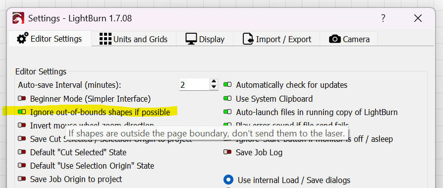 Bonjour, j’ai un petit soucis depuis la ré-installation de lightBurn sur mon Pc. J’ai dû oublier un paramètre. Avant quand je voulais graver plusieurs pieces d’un même projet, je sortais du cadre quadrié de Lightburn la piece que je ne voulais pas graver, mais maintenant Lightburn prend en compte tout ce qui est sur l’écran et plus uniquement ce qui est dans la partie quadriée. Quel paramètre dois-je changer?