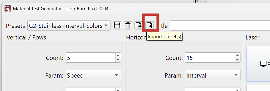 Because of the sheer volume of lasers that LightBurn supports, it’s simply not possible for us to create material libraries for every single device. We instead offer support to users and vendors to create their own material libraries. Material Test - LightBurn Documentation