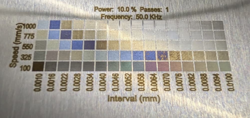 I found that the Speed and Interval settings produced the best color differences on stainless steel: