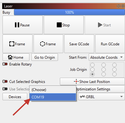 Once you have added your laser to LightBurn you need to select it in the “Laser” window, and choose the correct COM port in this drop down: