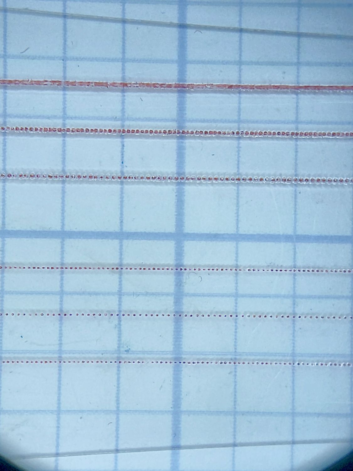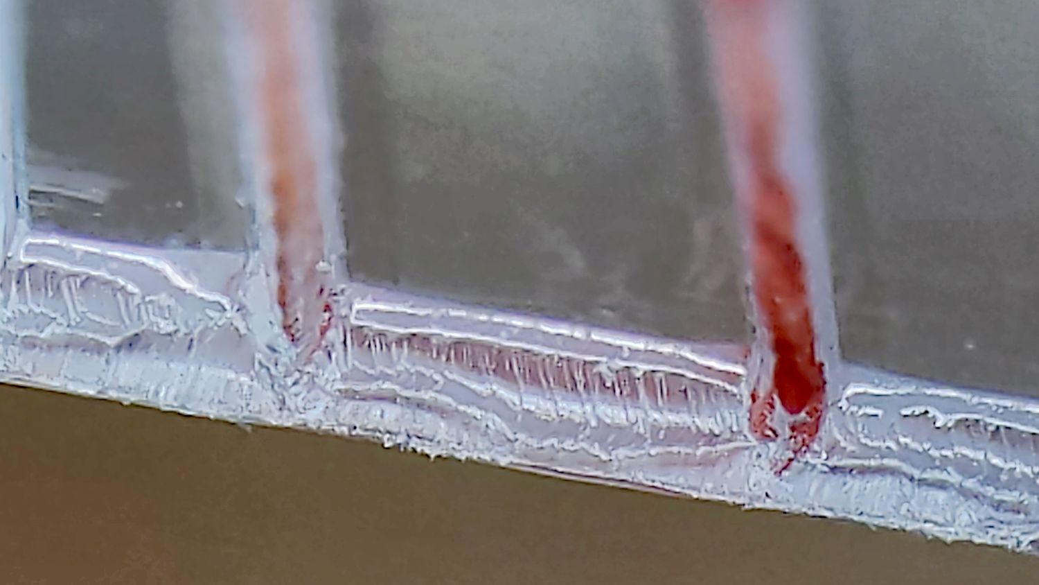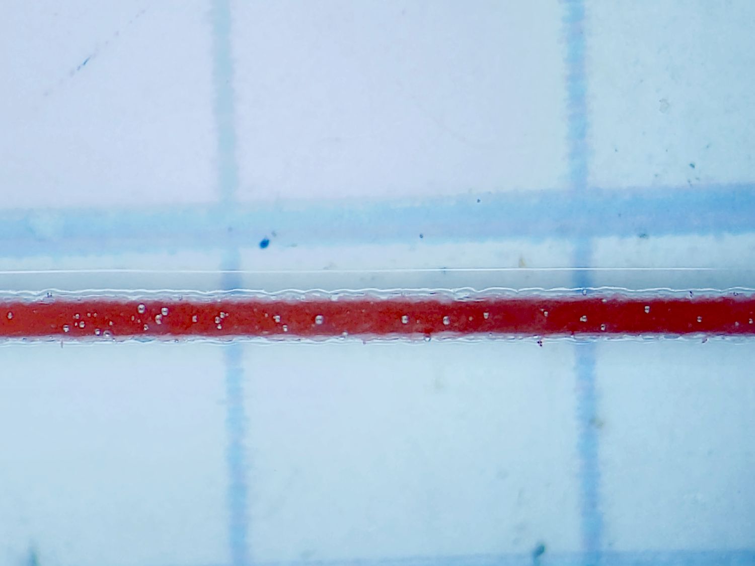 That’s 0.3 mm wide in a sheet of transparent PETG (atop on 0.1 inch grid paper). It’s filled with red enamel paint using the cut through the protective film as a mask.