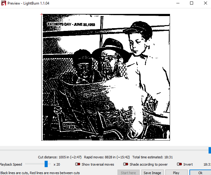 Nope! And now I am back to Engraving. I called up the image on the right I had just engraved to see what I had used for settings. The Cuts/Layers are different than what I put in. I think image was set to **/20 and Cut was set to 15/80. I saved the file and now it shows completely different numbers.