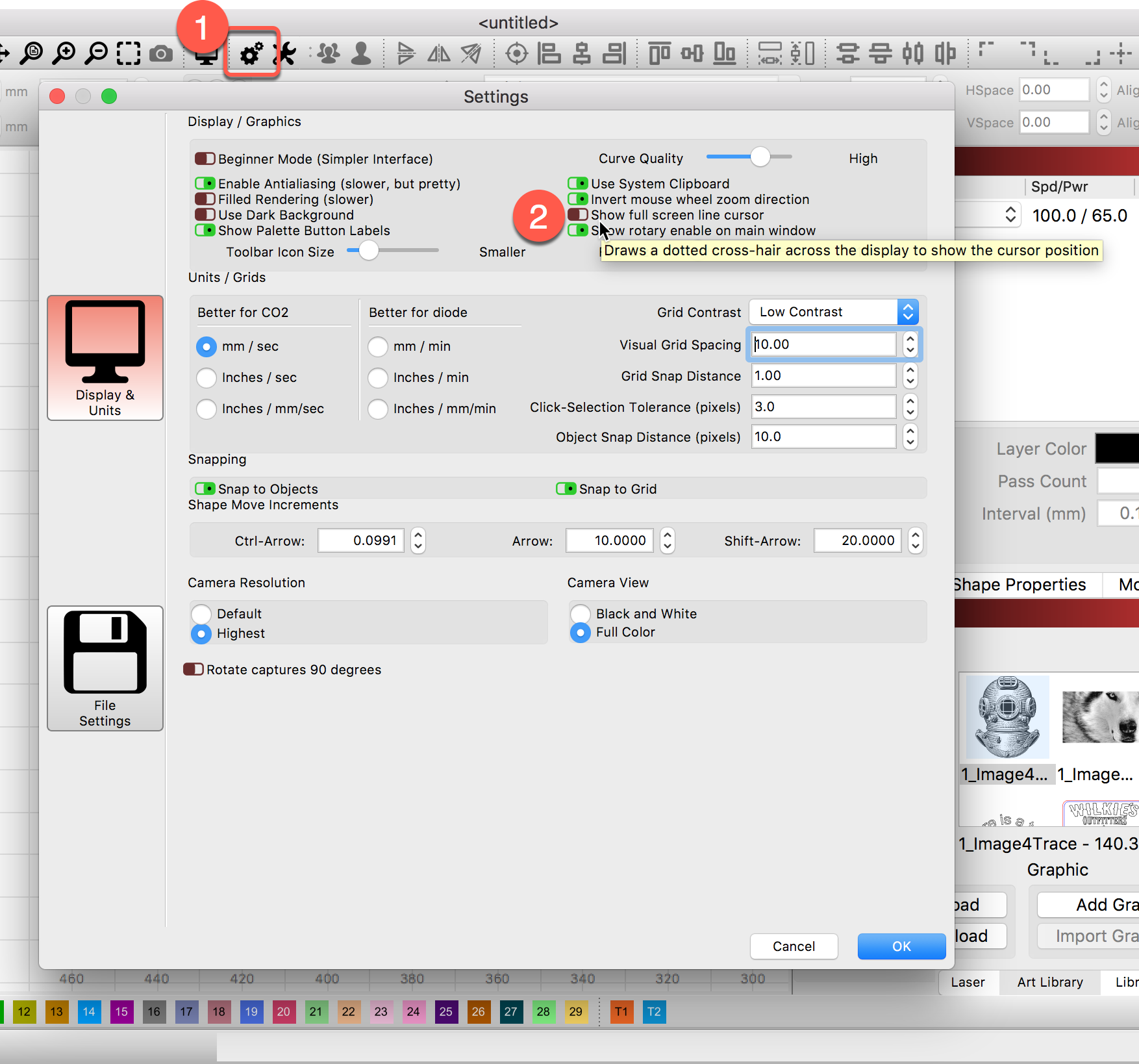 You can set the LightBurn cursor to display a ‘full screen line cursor’, helping to align shapes to the bed grid units shown at the sides of the workspace display.