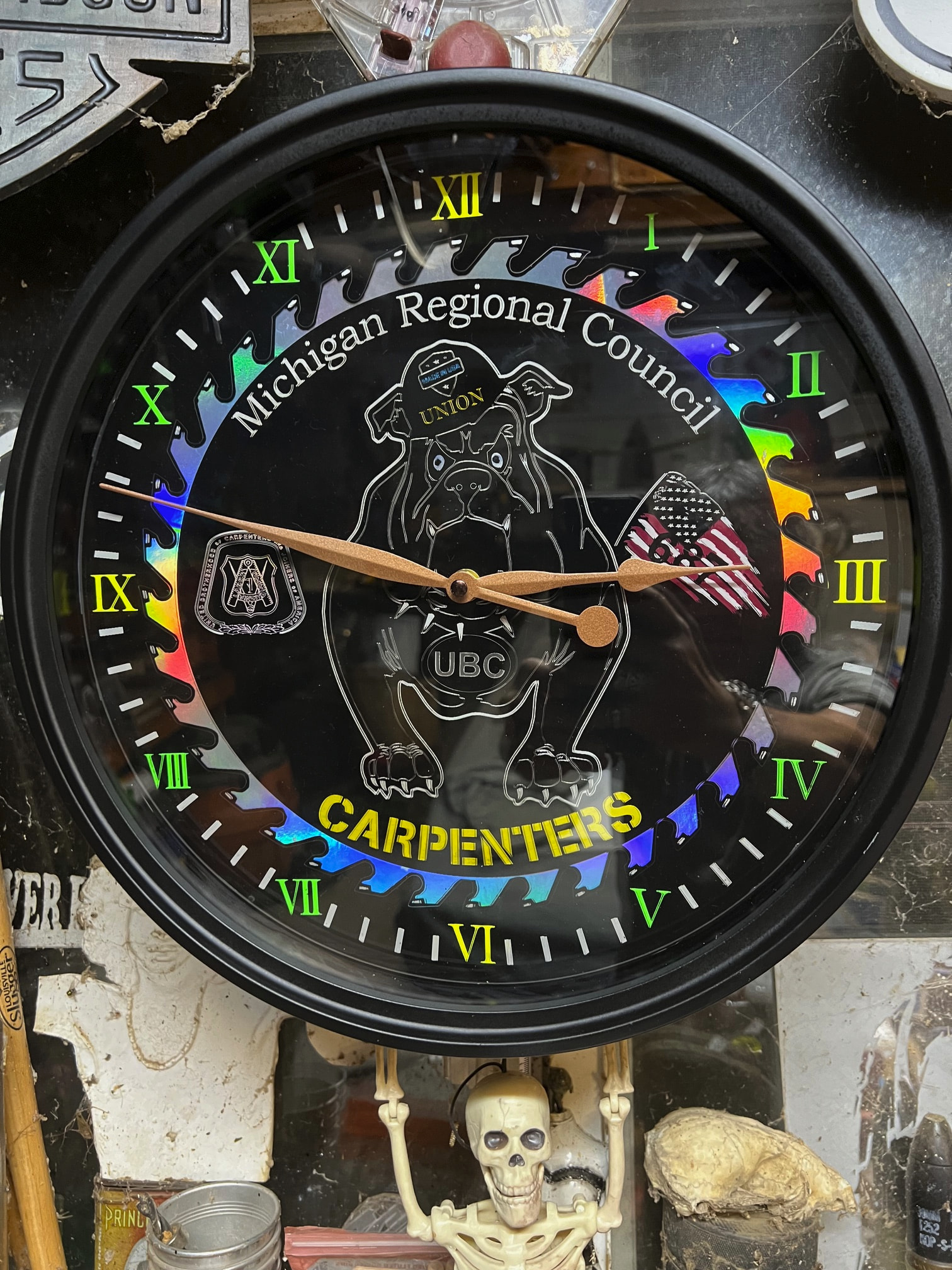 Got a clock from walmart, disassembled it and basically created a new face for it. I used a .125" plexiglas circle cut the same size at the old clock face, spray painted it black. Once the revered image was lasered onto the plexi, everything was clear, then I just used whatever color backings I wanted - This was made for a buddy of mine who runs a fitness/boxing gym for kids, just about any design/logo can be made, I did one for my carpenters union too. Notice the 1st one I installed a LED ring, other one is unlit, personally I like them better unlit. I can only use black for the initial background because my fiber laser won’t touch light colors, but I think black is best anyhow. total cost for the clock, plexi, led’s/controller/plug is around $30-$35
