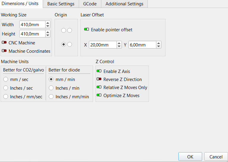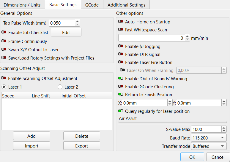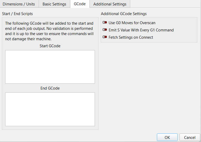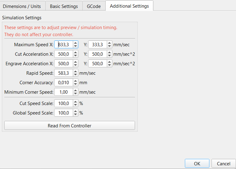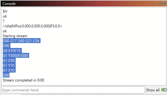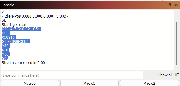 And the added G1 with every line. Only the first G1 move includes a Feedrate (F3000). That’s normal, and a GRBL controller should properly use the last speed.