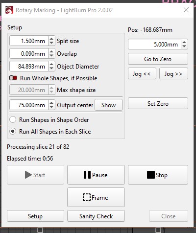 I was in the middle of a 44 count tumbler run and about half way it dropped down to about a quarter of the power. I stopped the project and rest the laser and reset the computer and kept getting the same issue. I then noticed it had changed the frequency from 30 to 75 in the middle of the run in the materials settings. I did not exit the rotary marking control panel when it changed the setting. I changed it back and it was back to normal.