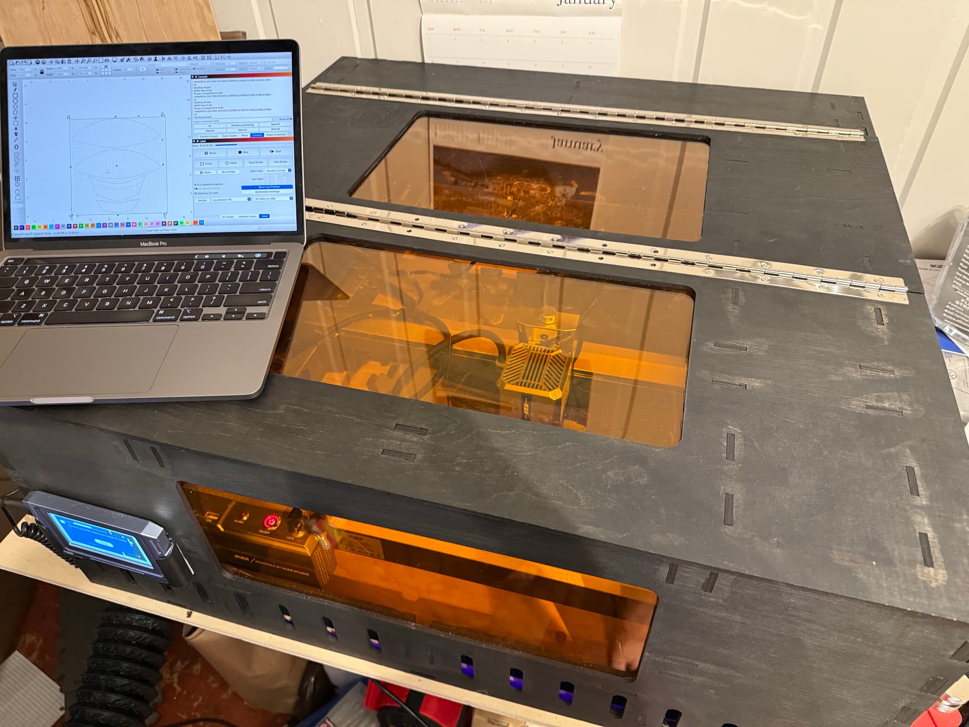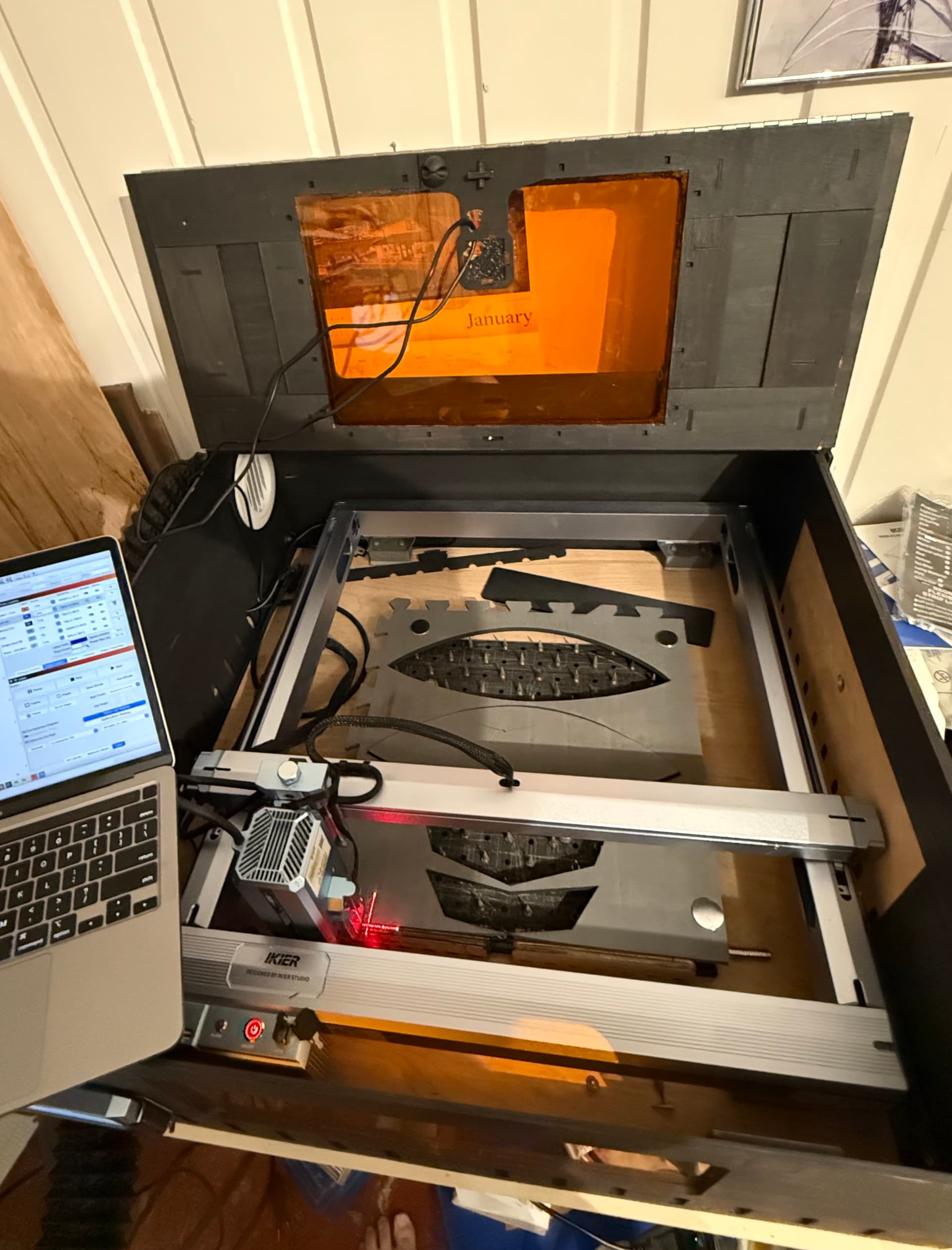Including this in Finished Creations because it was 100% cut on the laser (go Print & Cut!). The enclosure is for my Ikier K1 is roughtly 30"x30"x12". The design includes windows, side passthroughs, multiple tunable air intakes, a camera mount… basically any feature I could think of.