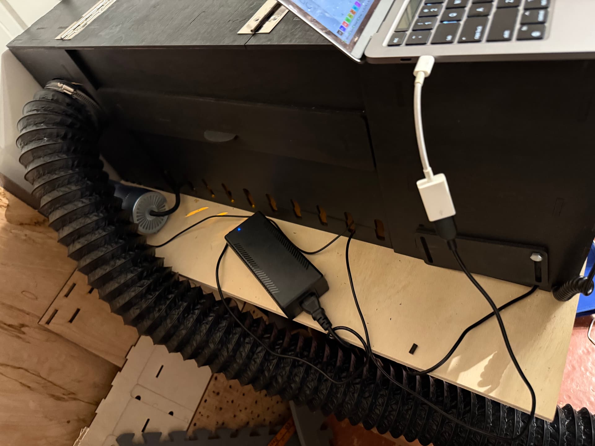 There are things I did a little wrong: Too much ventilation, I have (or will have) sliding covers and inserts to tune air intake as needed, but there’s just too much - a 30-50% reduction would make sense), I didn’t cut the cable cutouts high enough, I probably could have used less windows - maybe just one on the front), I should have made it taller - the air assist hose catches on the camera.
