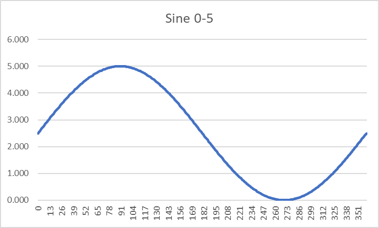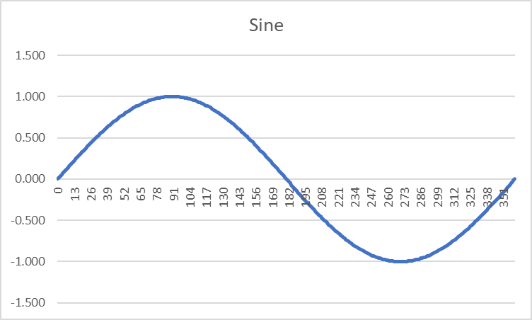 So, switching to digital, imagining a sine wave (I know, the two ideas are incompatible, but bear with me for now). Cycle through 360° and the value of sine moves from 0, through 1, down to -1 and back to 0. If it does that once per second, that’s 1Hz, correct?