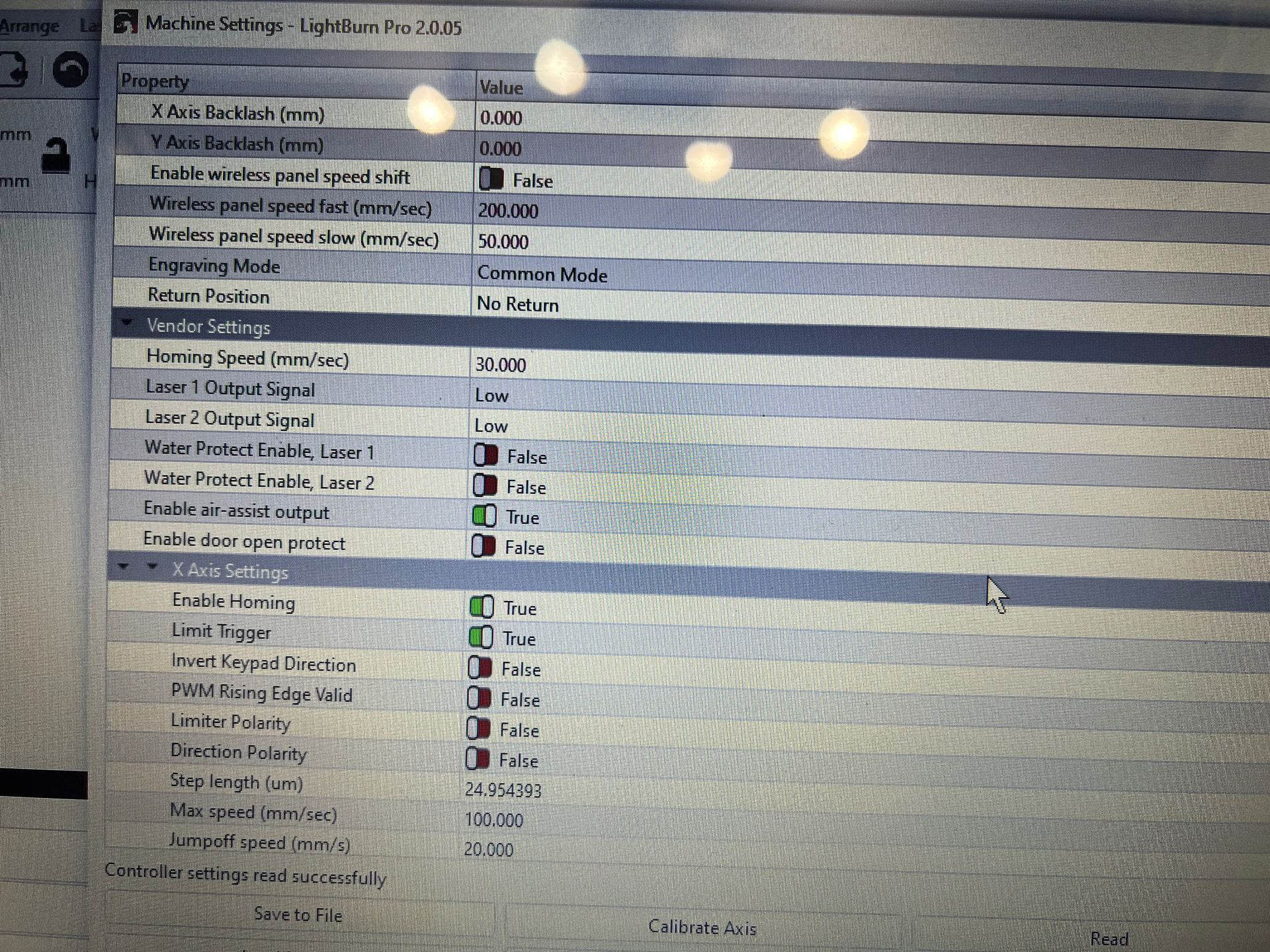MikeyH had stated lightburn does not change the frequency, however when it does the material test it does burn in the words frequency 20kHz, and on the above override box on mine it has 20kHz if i turn it on……