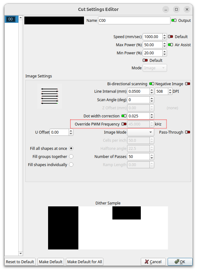 Just upgraded my neje 40640 to the laser tree k20-pro due to wanting a bit more power. trying to find out at what frequency lightburn defaults too? Issue is if I run the material test which it states is being ran at 20k hz….if I try to cut with the best out of that material test, it fails to cut?