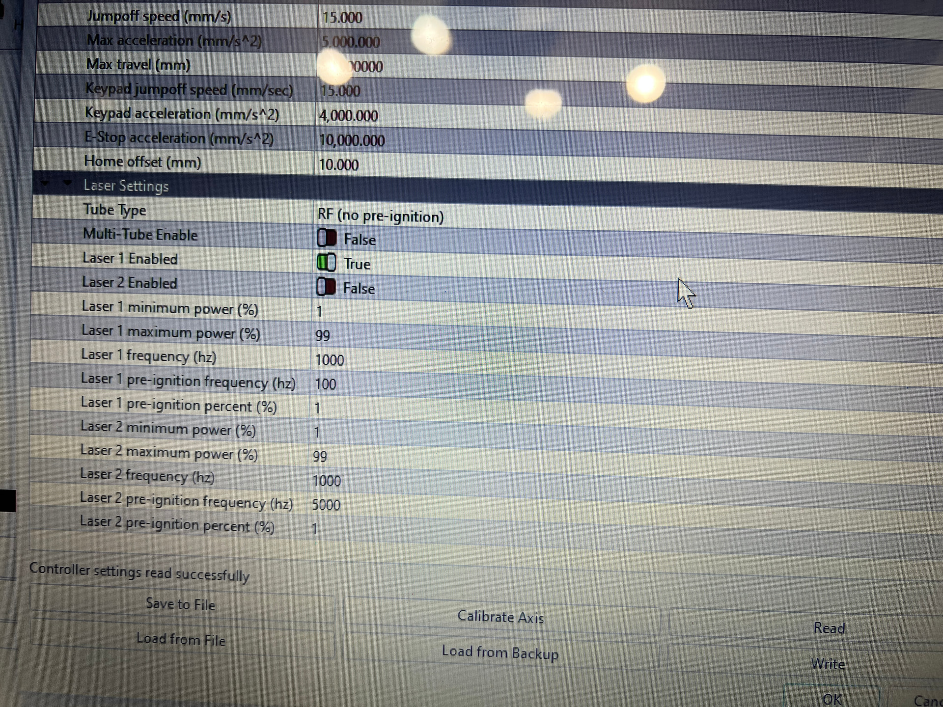 best cut was at 400mm/m and 100% power, so i made a 30mm square and used those settings, did not cut even 1/2 way through? ( see box at top in pic) So something is defiantly different… I also went into the advance settings and enabled over ride freq set to 1k than disabled, this basically just changed what was written…..was engraving 20kHz, after the change engraved 1kHz, made no difference in the cut. So still at a loss as to why?