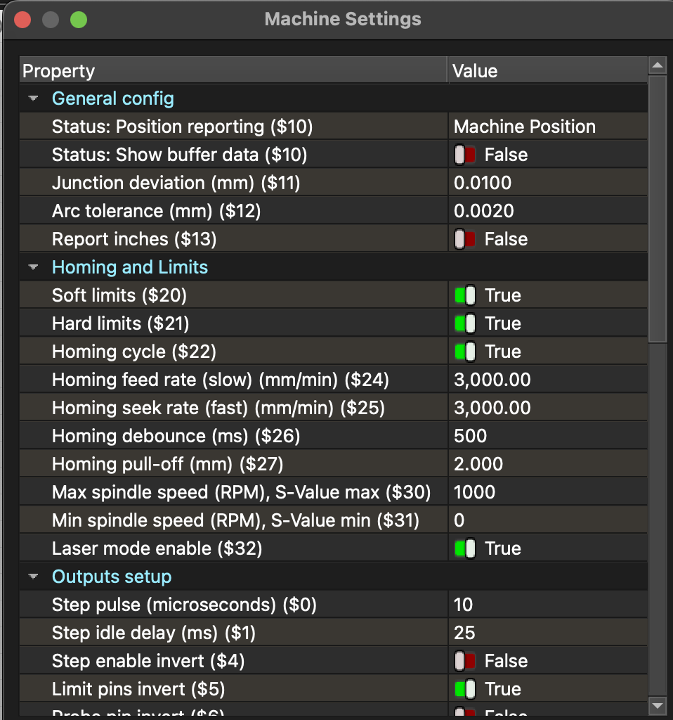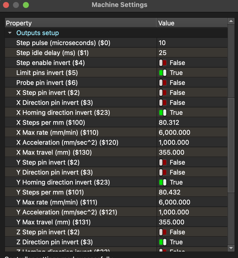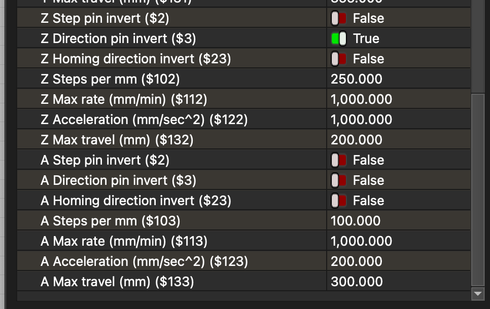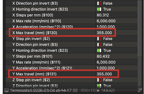 $130, and $131=355 are the X- and Y-axis maximum travel distances. Youâll need to change the $131 value to the new extended distance and reflect those changes in the LightBurn Device Settings.