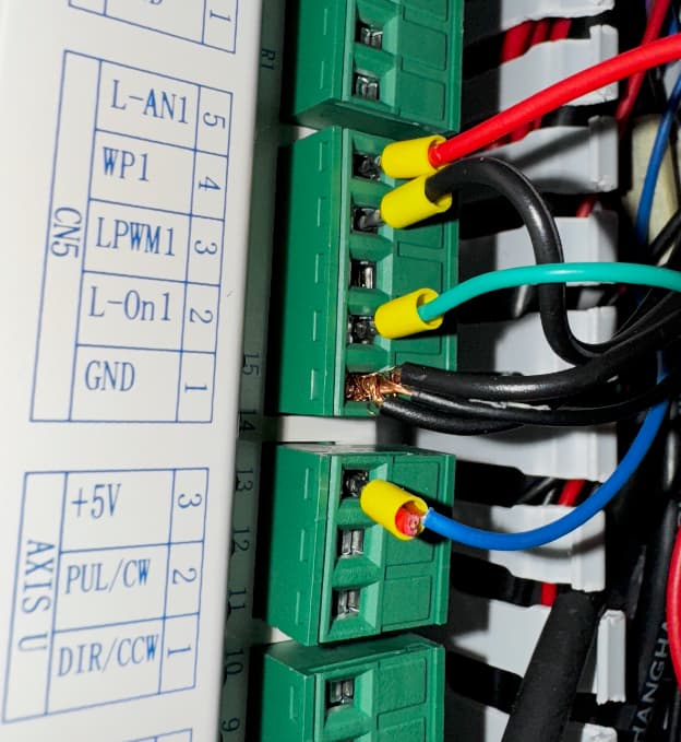 You can check the AXIS U:+5V against CN5:GND, same for L-On1, which should also be 5V when the machine is idle and close to 0V when active.