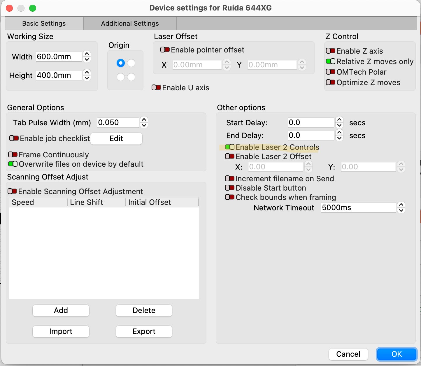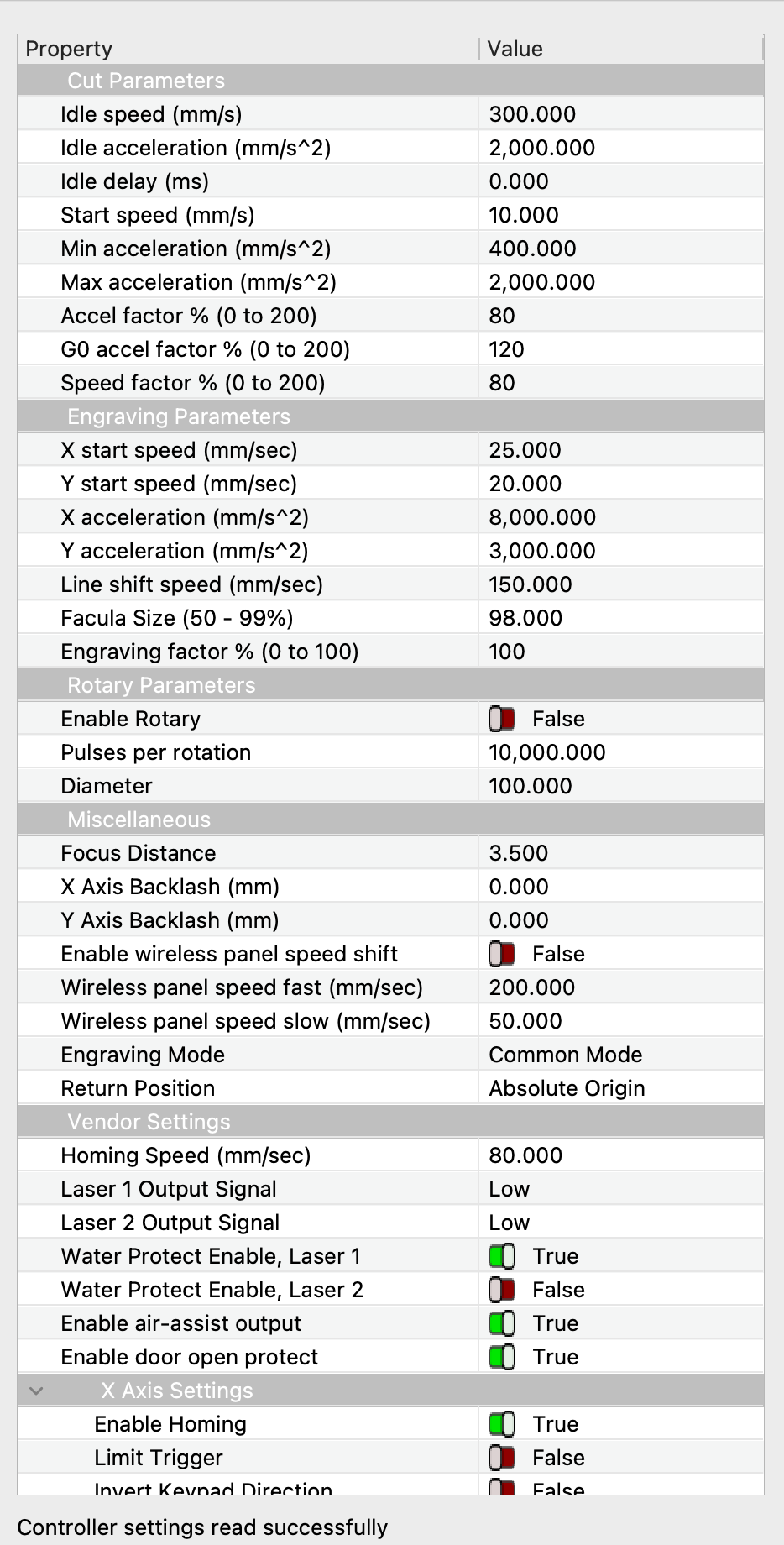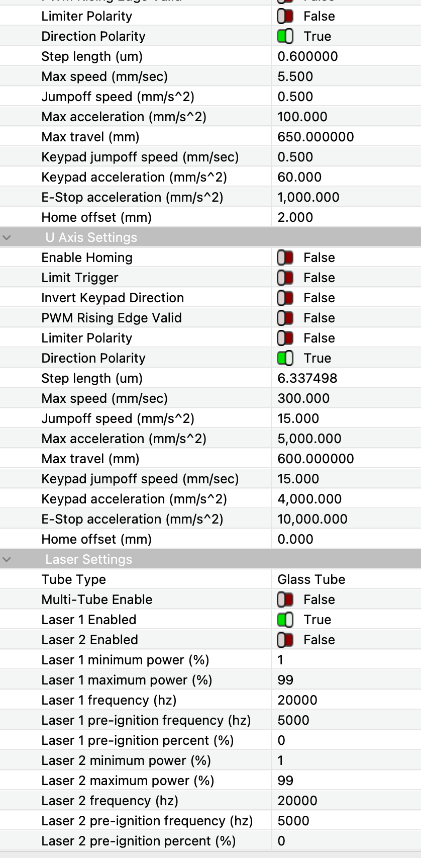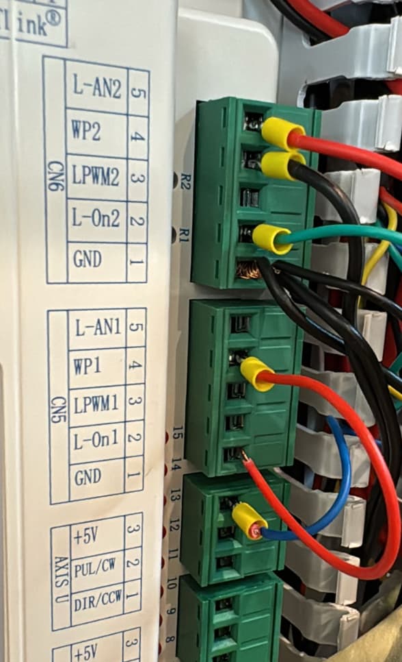 You might need to try enabling Laser2 at the controller and using all the signals at CN6 instead of CN5, to do this you also need to enable ‘Laser 2’ in LightBurn and use the Laser 2 controls: