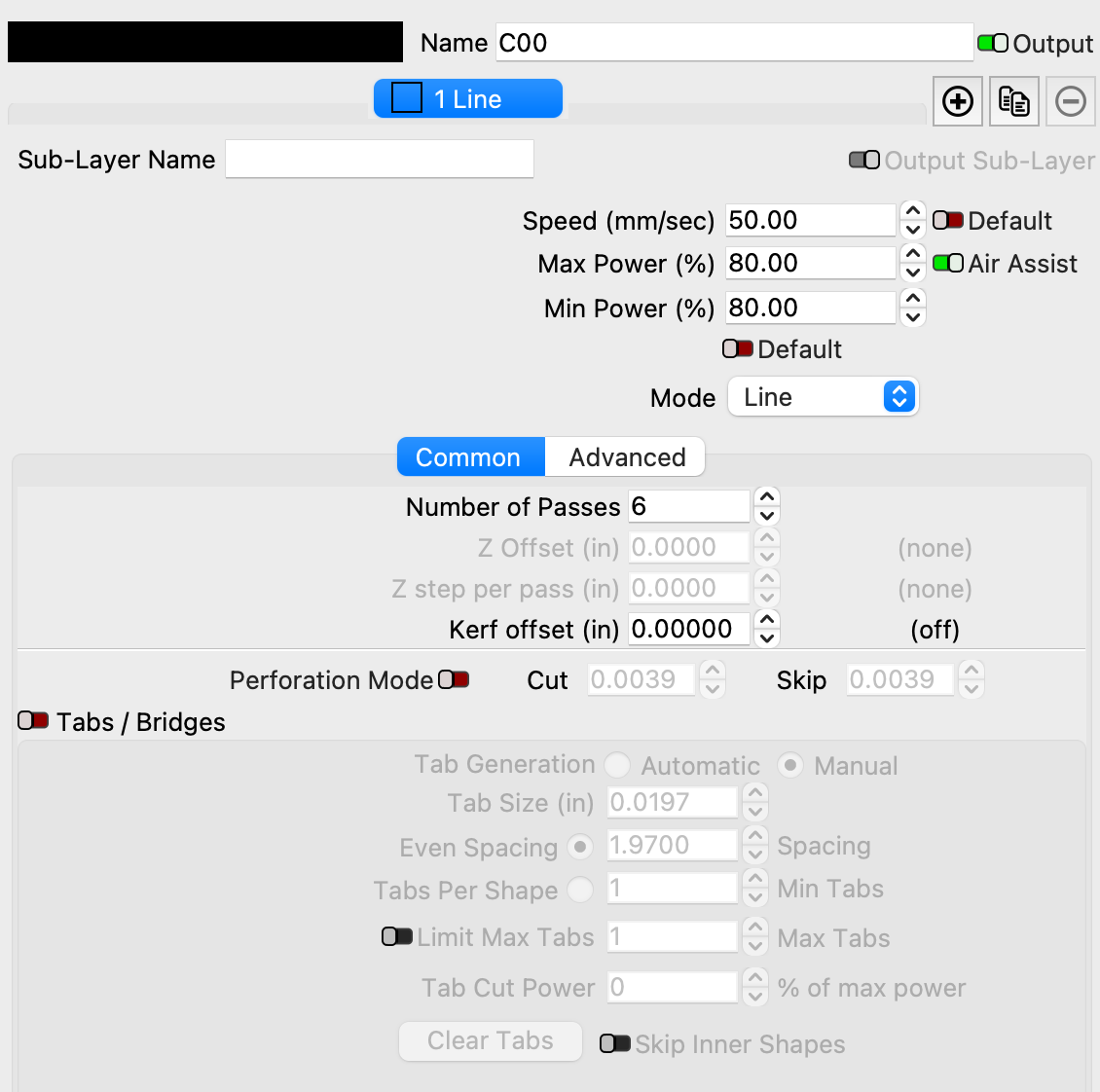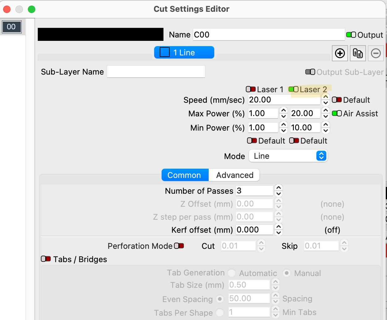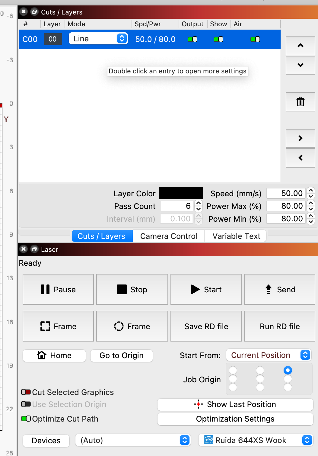 Test job could be a circle with several passes - or low speed and power set to 50% and use ‘Line’ mode.