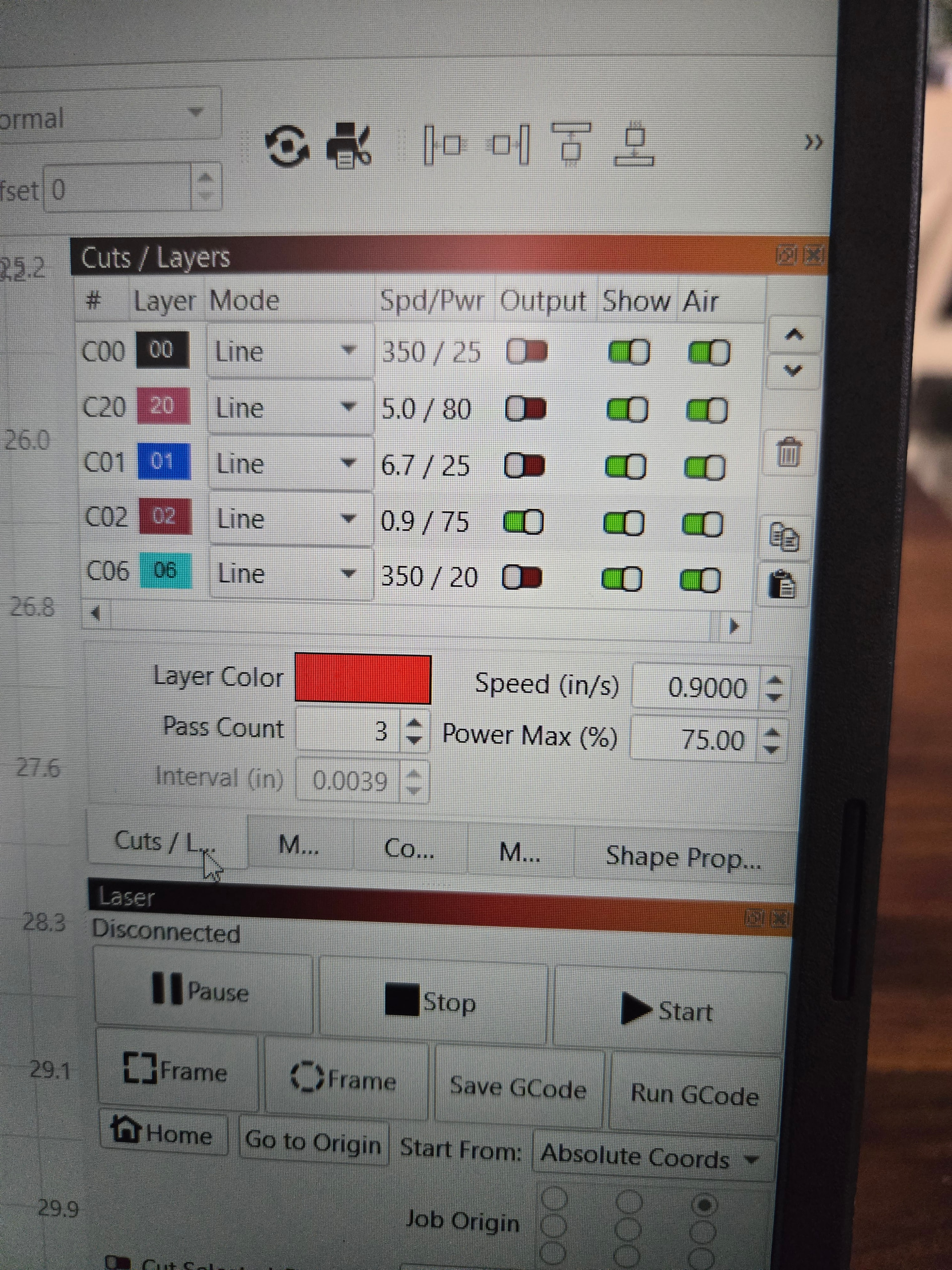 Your layer 00 (350 in/s) corresponds to 8890 mm/s … that is very fast - too fast for a laser machine.