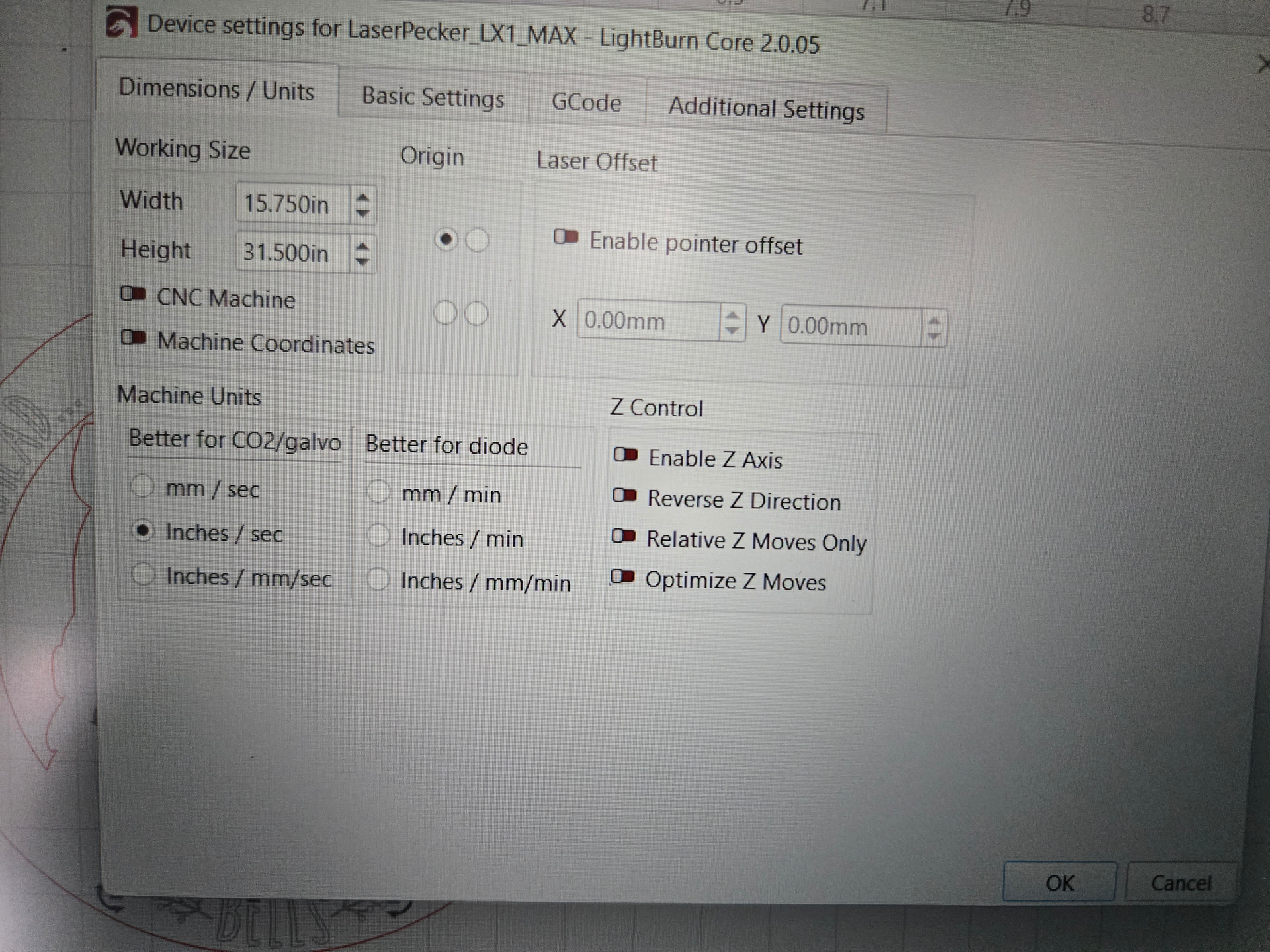 I’m using a laser pecker LX1. Max and I had issues this week with it dropping the configuration file which I managed to place and now it works. However, I’m not sure if it is the new update but the settings that use to be, are now completely different. I have it moving at a speed of one inch per second power. Max at 70 and this laser is flying through the work when I know it should be going slow as a snail.