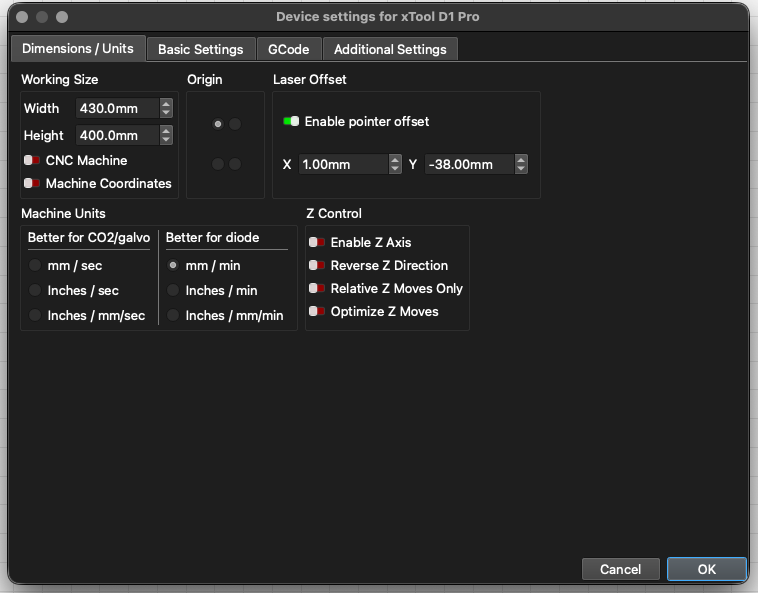 Everything works fine on a flat surface. As soon as I switch over to my rotary chuck tool, the laser offset won’t work. The laser moves fine on the y-axis, and the rotary tool follows command on the x-aix or z-axis(not sure of the correct term there), but the traveling metal beam wont adjust the module above “the 38mm” off set that is needed to be dead center on the tumbler I am trying to engrave.