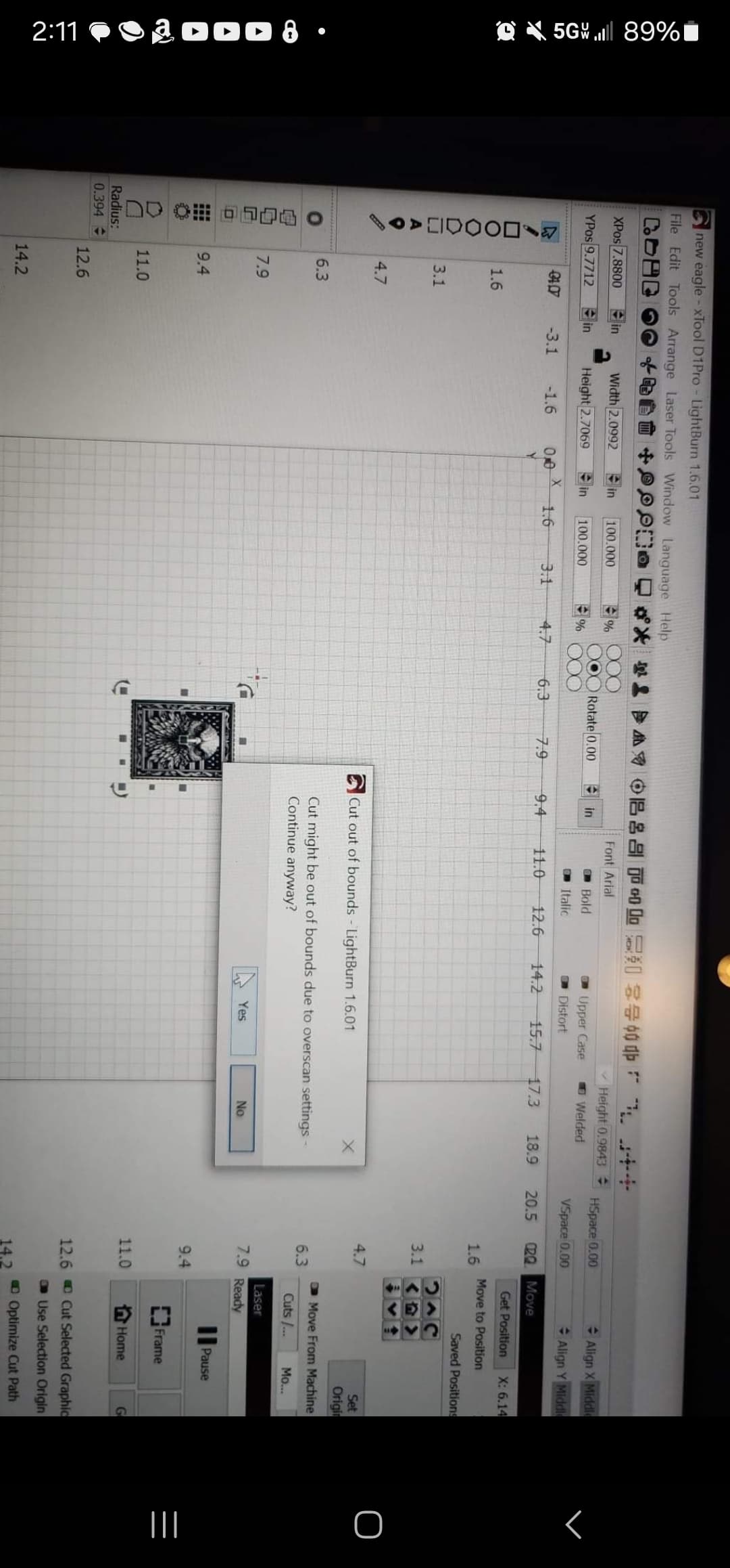 Laser will not engrave or make lines. It says cut might be out of bounds due to over scan settings. I have made this image multiply times with no problem. I even resized it down to 2 inches by 2 inches. It still says the same thing. Also when I move something to engrave it isn’t moving properly. It is not the laser I used the old software and it moved fine.