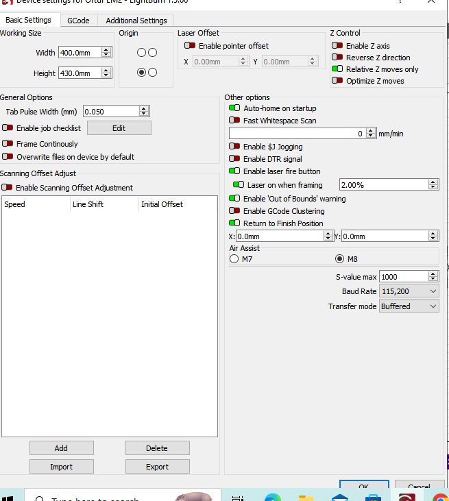 I think that as the program runs, the last of the cut path is buffered to the laser controller and then a “reset” signal is sent out. Unfortunatley, the cut has not finished. Every program that fails does so in the same manner. even running a material test. stops somewhere on the last square of the grid before cutting out the outline.