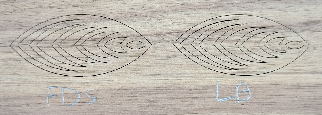 I ran the same SVG with settings the same in Falcon Design Studio as in LB, 3000 / 25% 9 passes and you can see, Falcon Design Studio on the left did a better job of getting that last little bit before turning the corner(smaller uncut section).