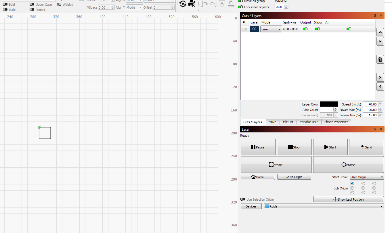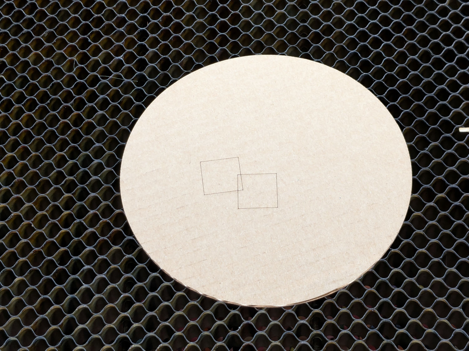 Both the LightBurn file and the RD file work fine, although I reduced the power level to a level suitable for cardboard: