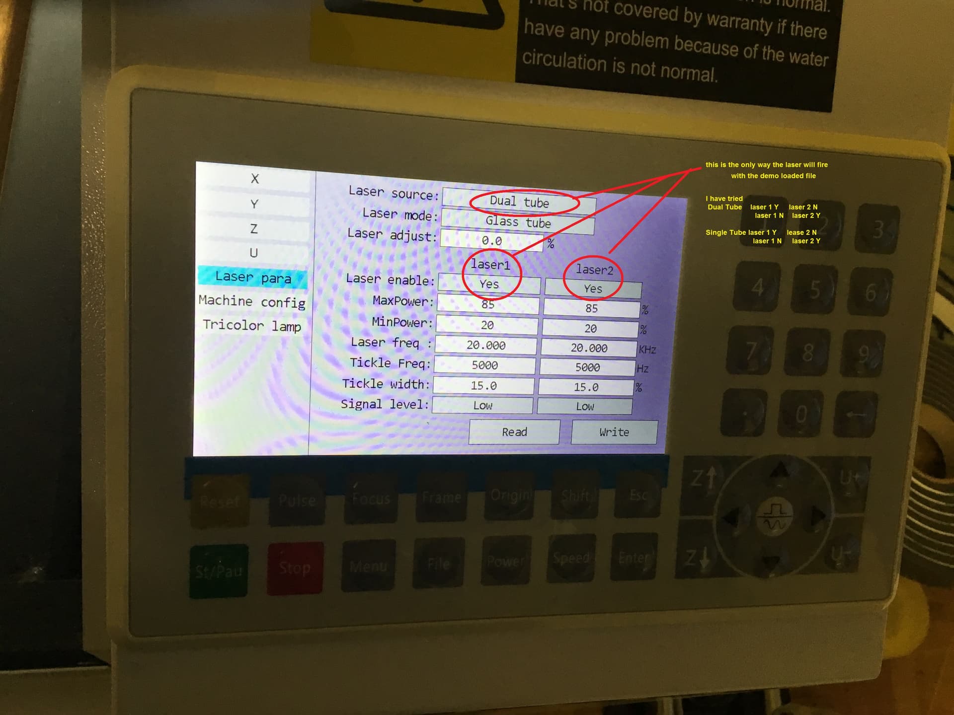 In the Ruida it is set up for 2 lasers, if I turn either off the supplies demo follows path but no laser
