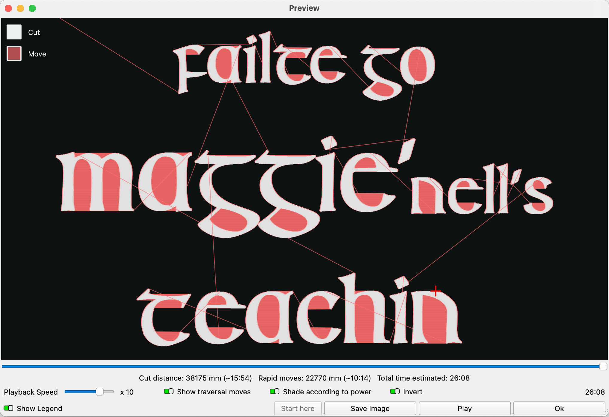 When lasering text my machine will burn the first letter and then travel all of the way to the last letter in the line and burn it, then all the way back and burn second letter, and all the way back to the end and burn next-to-last letter, and then to the middle of the line and burn just part of a letter , etc, and this really slows the job down.