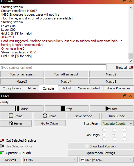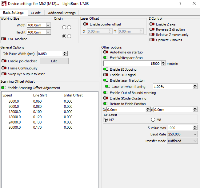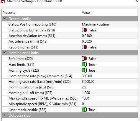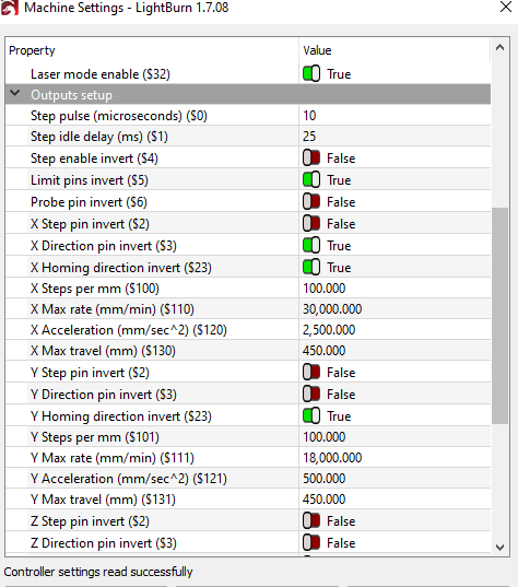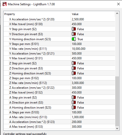 I have a MK2 Lasermatic but I haven’t been able to set up homing. Now I am getting error alarms 1 & 3. Can someone provide me a screenshot of the properties to set it up. Not sure what an I doing wrong.