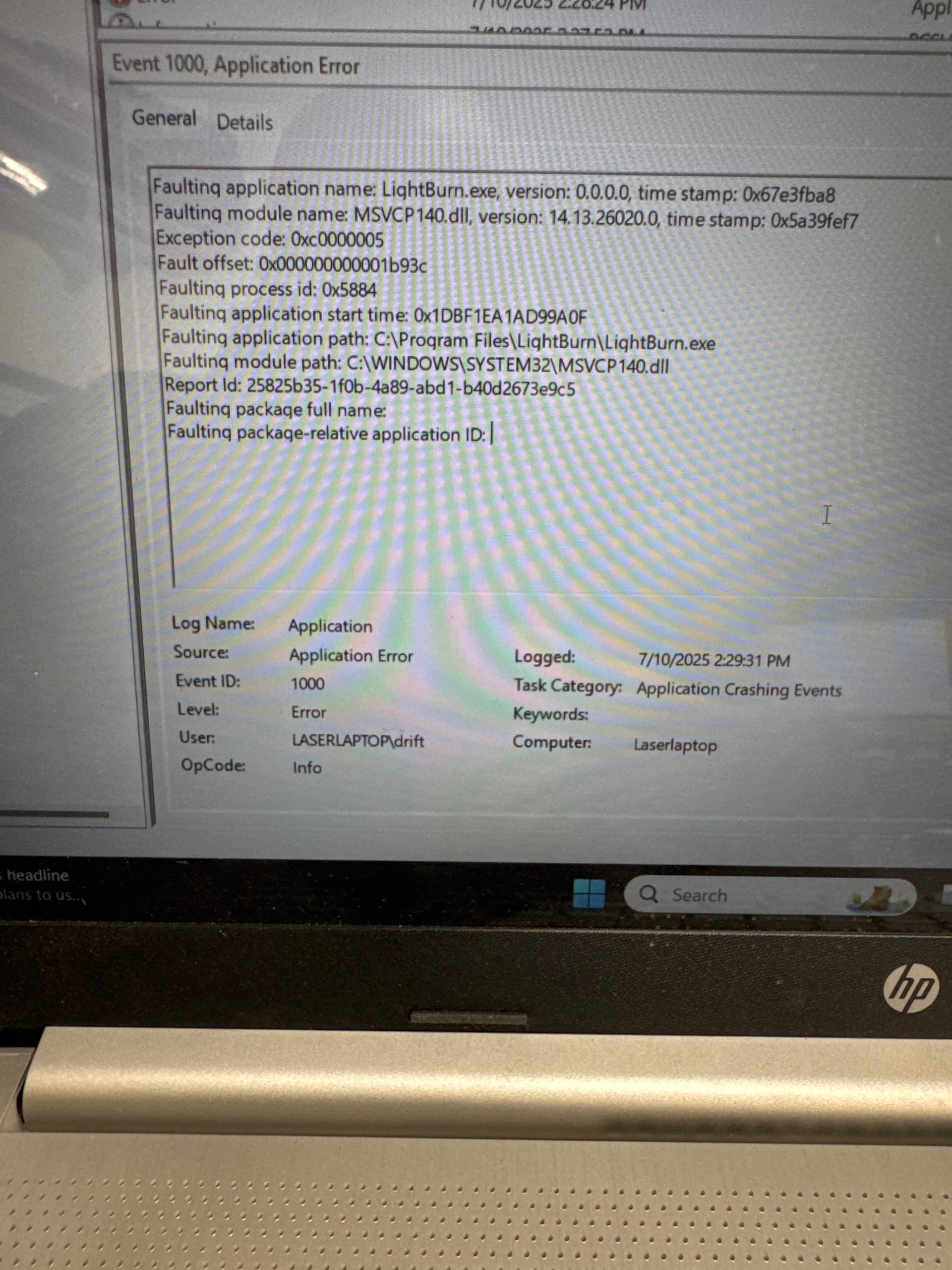 Went to open lightburn this morning and it won’t open. I just updated it to the new version the other day. I tried reloading the 2.0 software, I tried uploading the old 1.7.08 software, I updated the C++ redistributables and reinstalling the software…. Nothing. The pic is what the event views is saying.