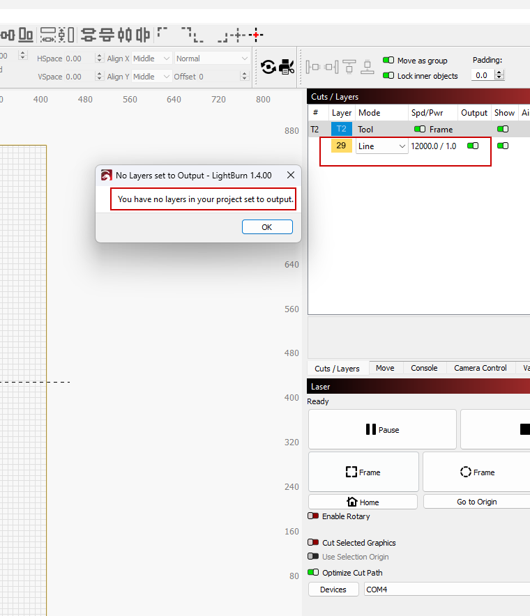 In the Cut Settings Editor for that layer, is the Output toggle in the upper-right corner turned on?